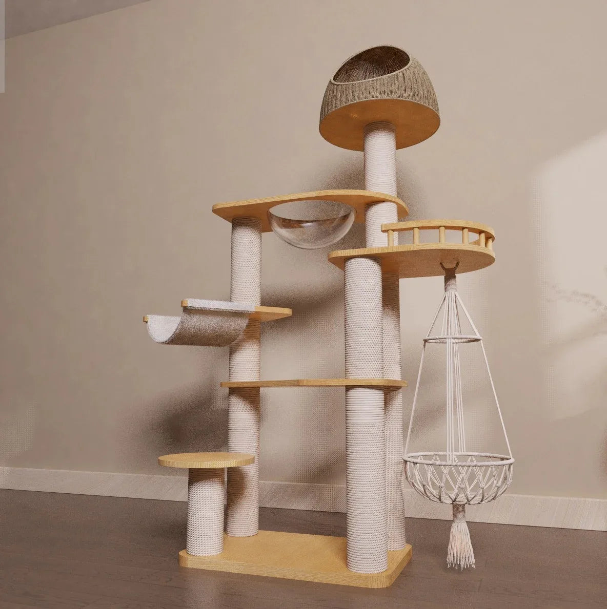 高質橡木純實木多功能貓爬架連太空艙貓窩連貓床 R3 (加粗貓抓柱6層款|170cm)